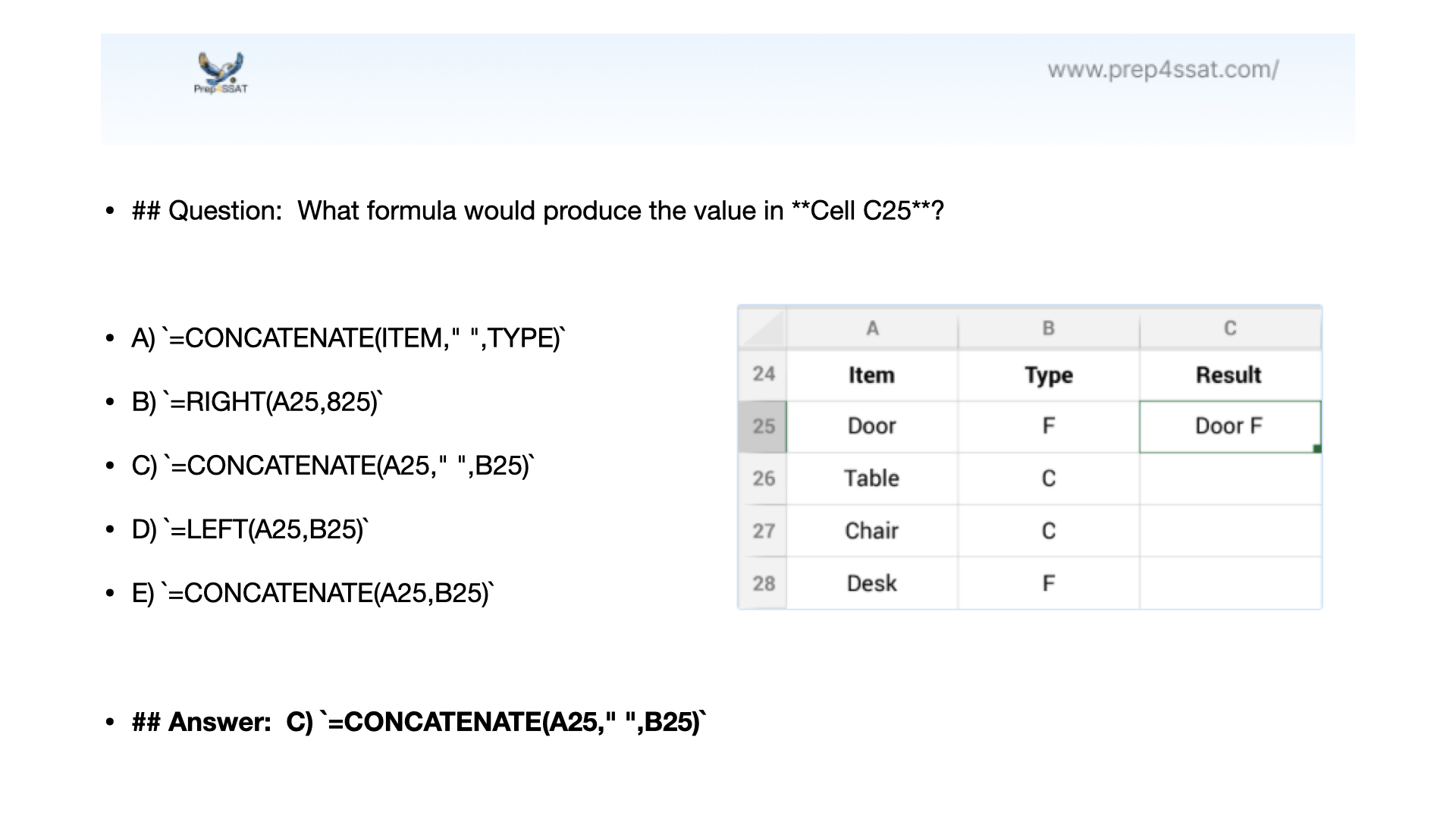 Answer: C) =CONCATENATE(A25," ",B25). This formula combines the value in A25 ("Door") and B25 ("F") with a space, resulting in "Door F", which matches the expected result.