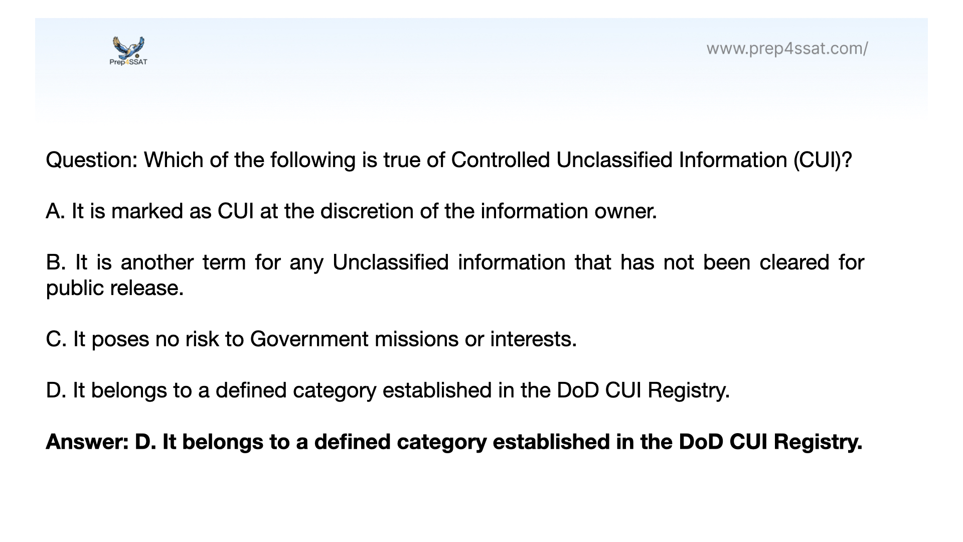 Answer: D. It belongs to a defined category established in the DoD CUI Registry. Option D is correct because Controlled Unclassified Information (CUI) is categorized and defined within the Department of Defense (DoD) CUI Registry.