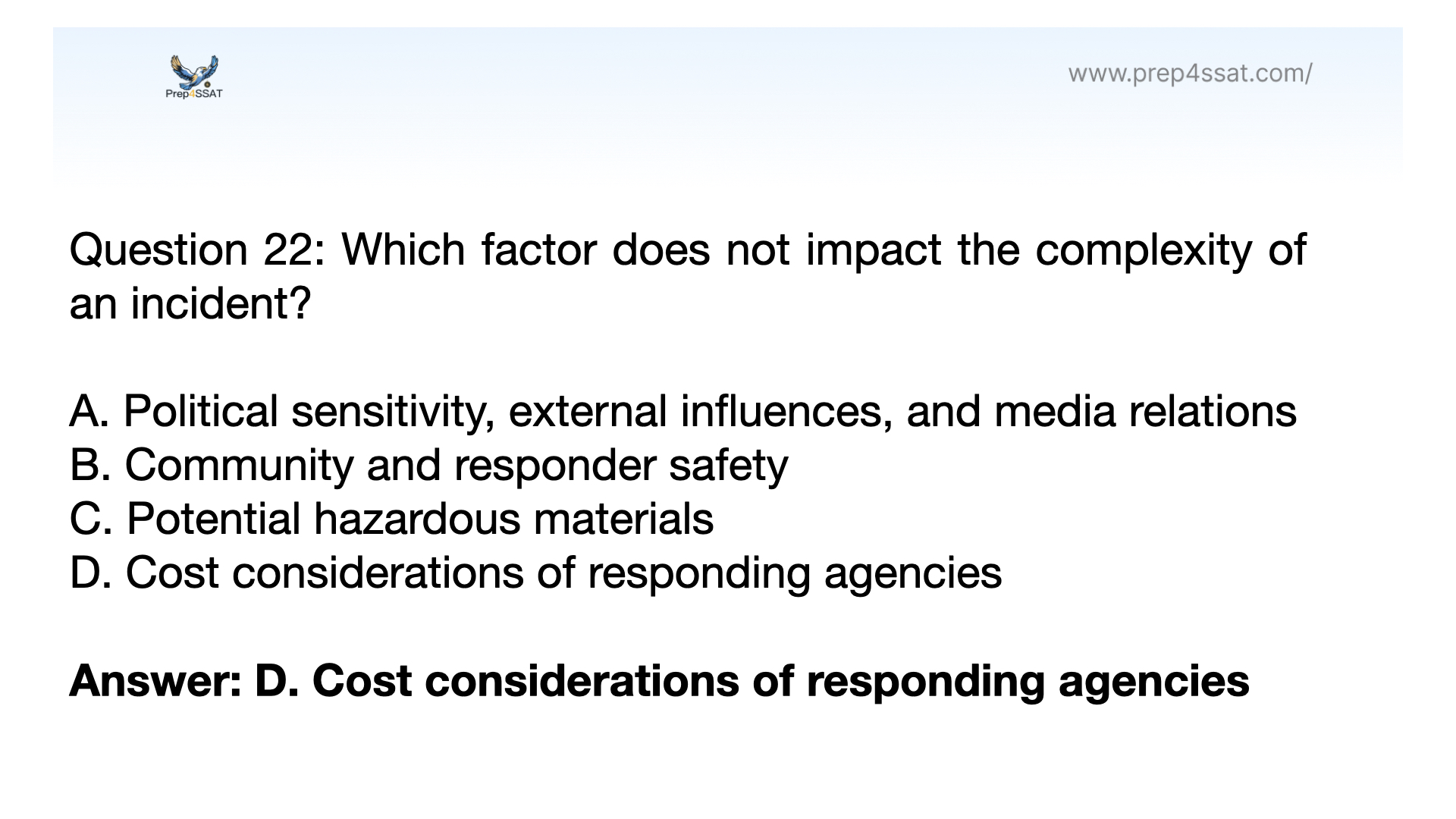Answer: D. Cost considerations of responding agencies. Option A involves political sensitivity, external influences, and media relations, all of which can complicate incident management by introducing additional layers of communication and stakeholder management.