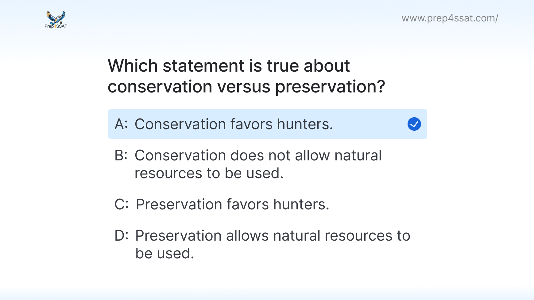 Conservation focuses on the sustainable use and management of natural resources, allowing activities like hunting while maintaining ecological balance. Preservation, on the other hand, seeks to protect nature from use, keeping ecosystems undisturbed.